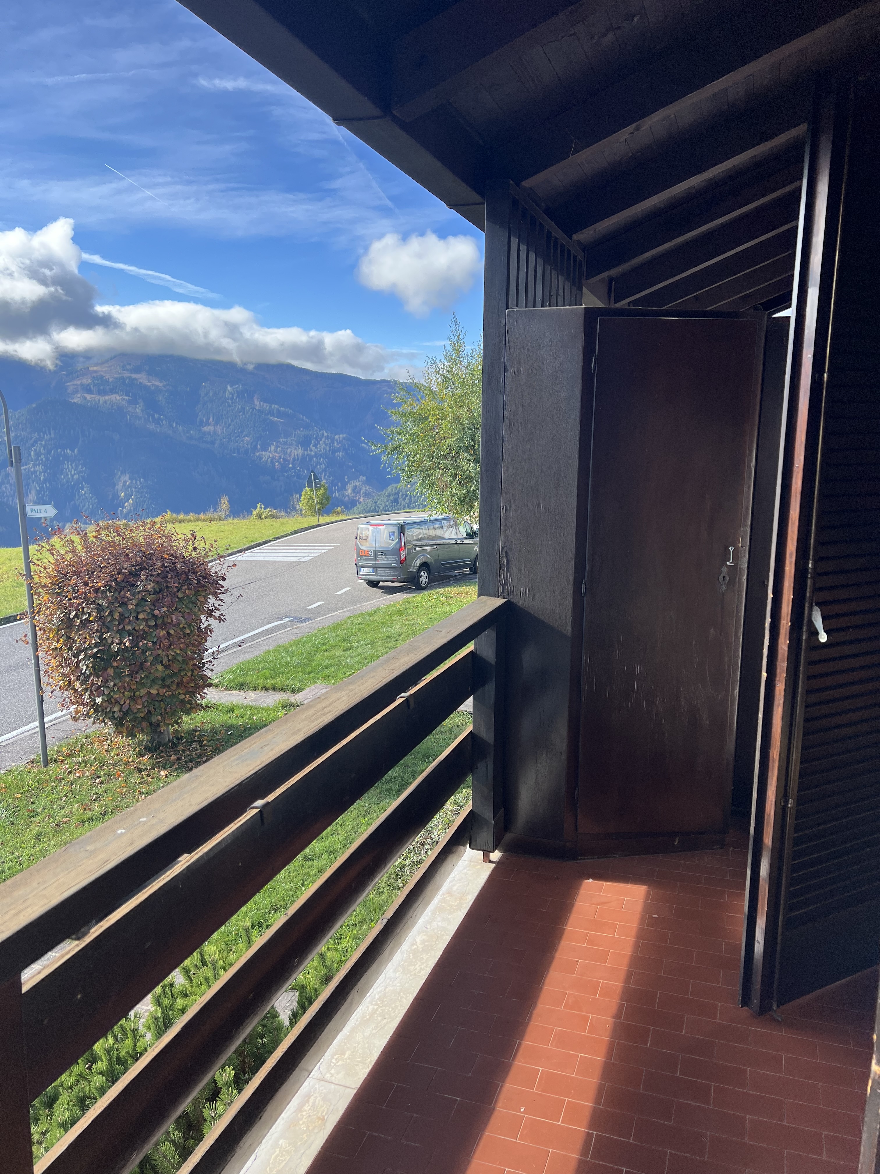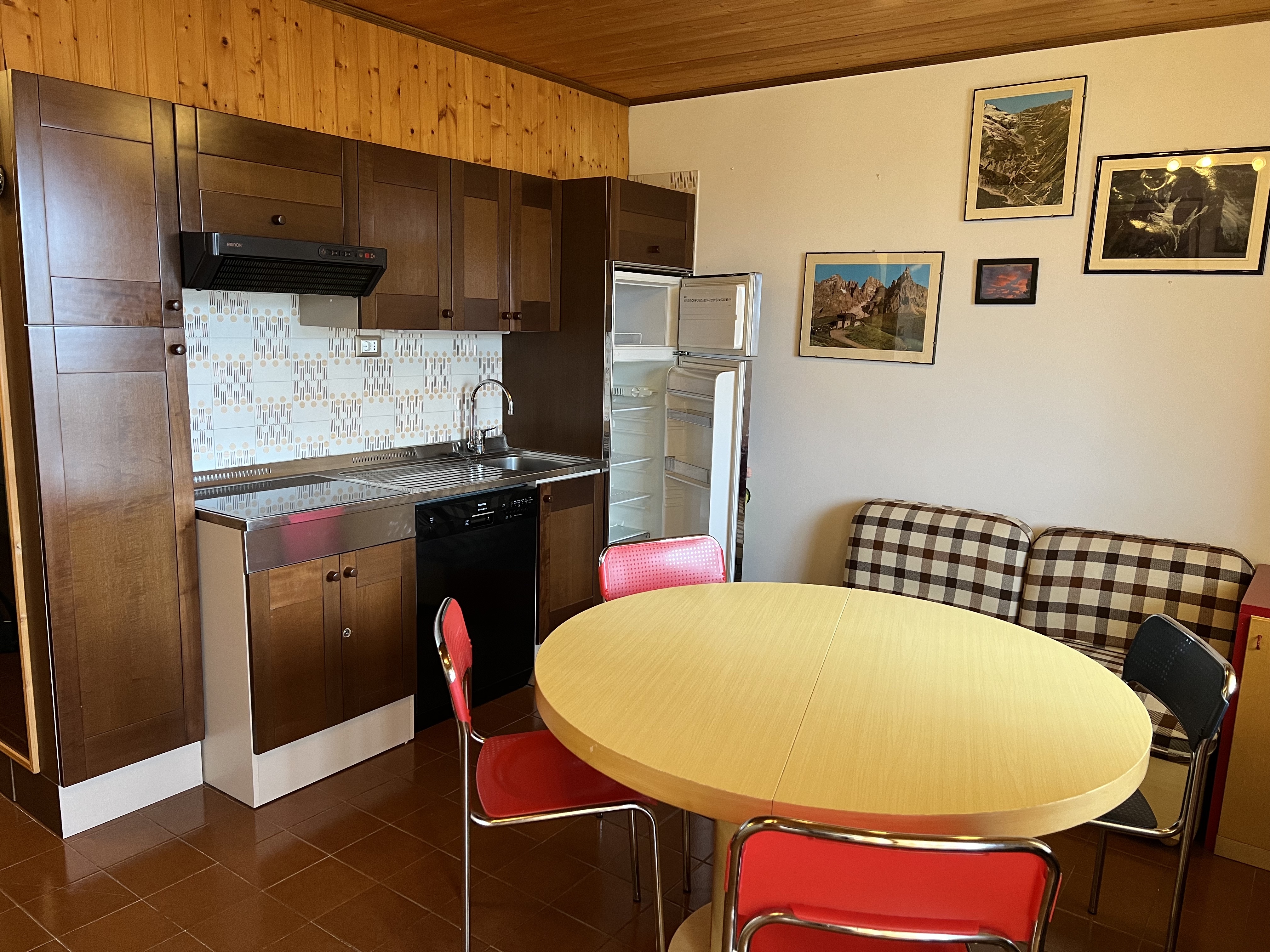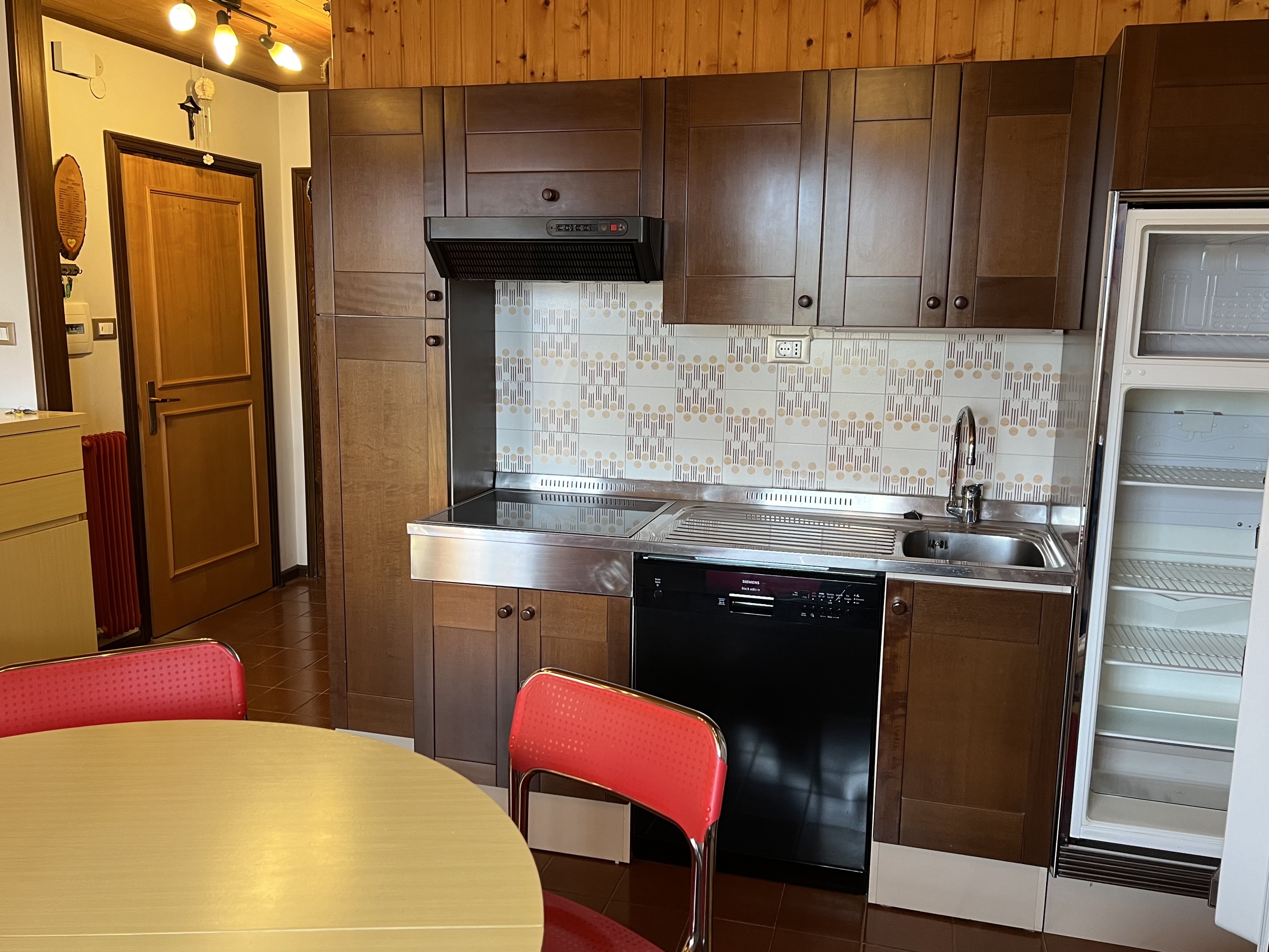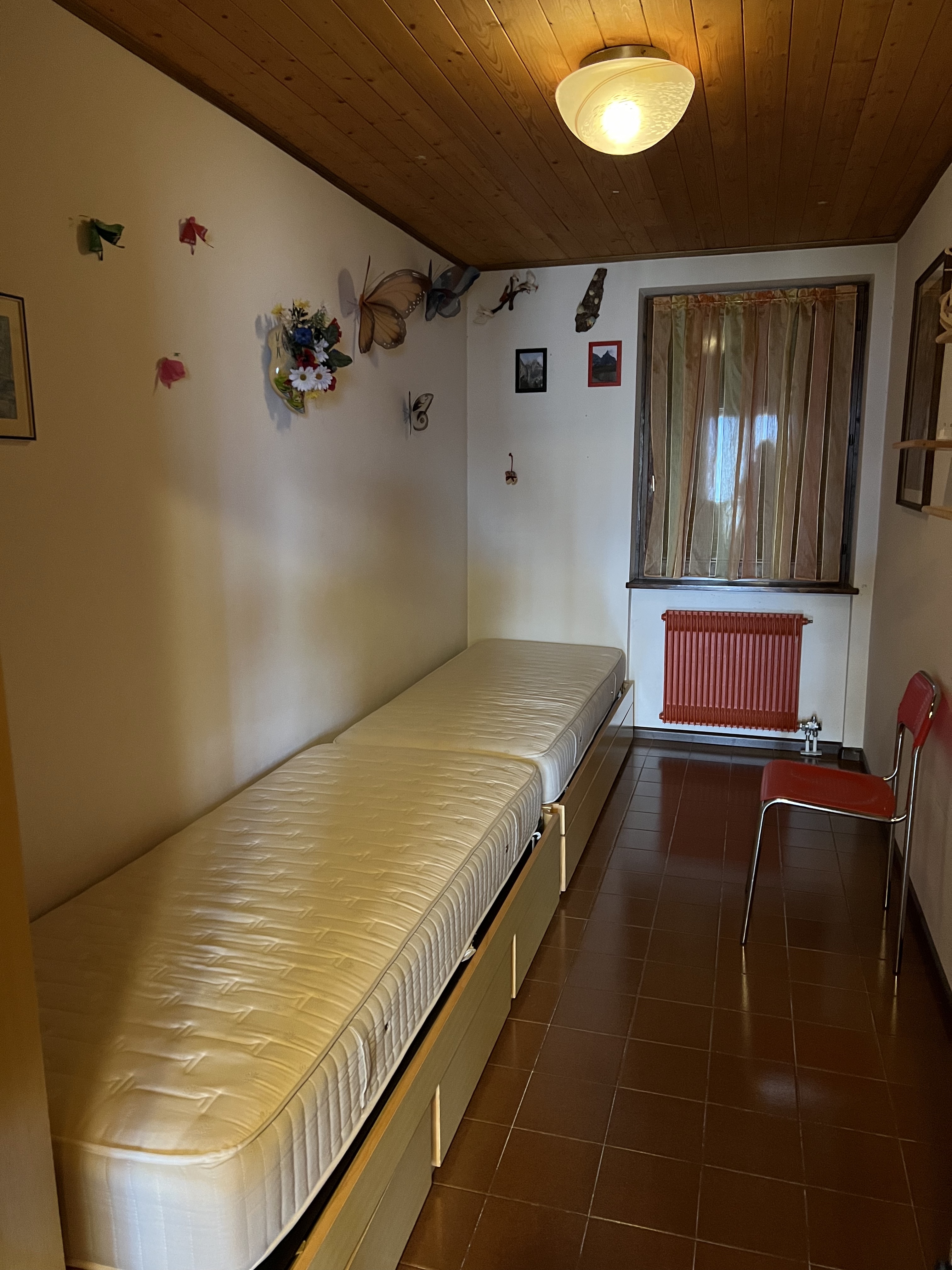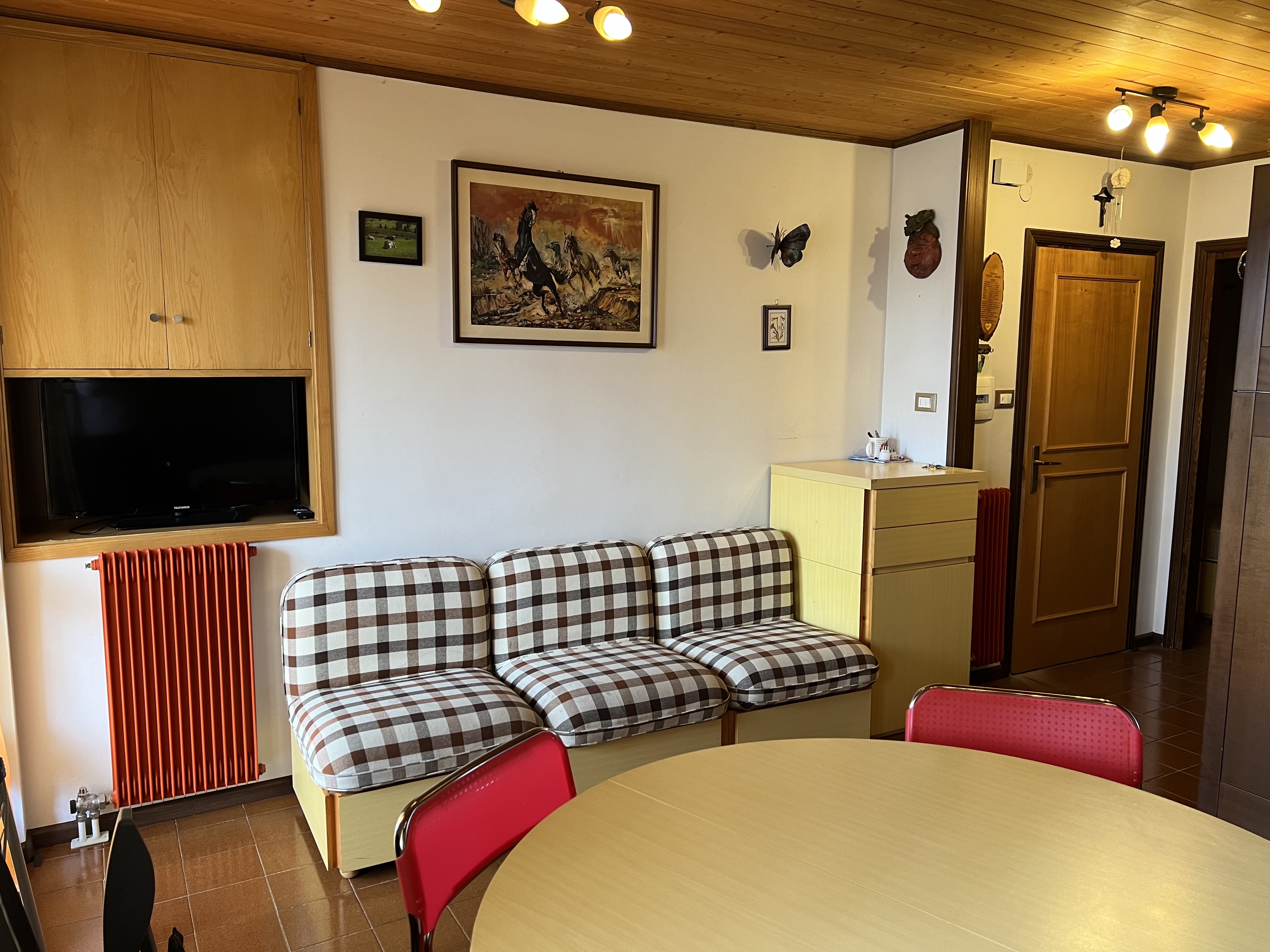 Appartamento trilocale a primo piano costituito da soggiorno pranzo con angolo cottura, due camere, bagno, sottotetto, balcone con ampia vista panoramica. A pian terreno box auto di proprietà.