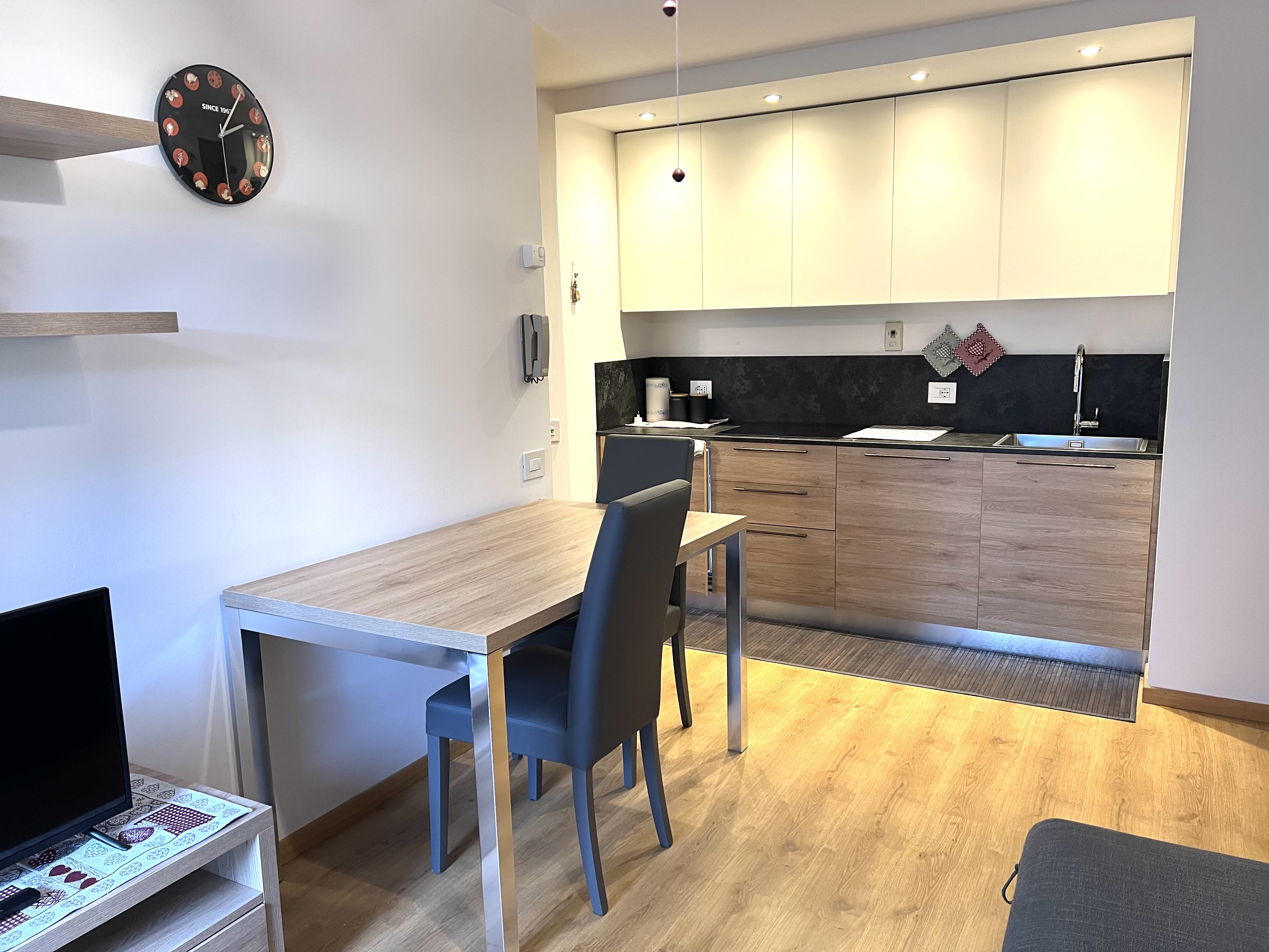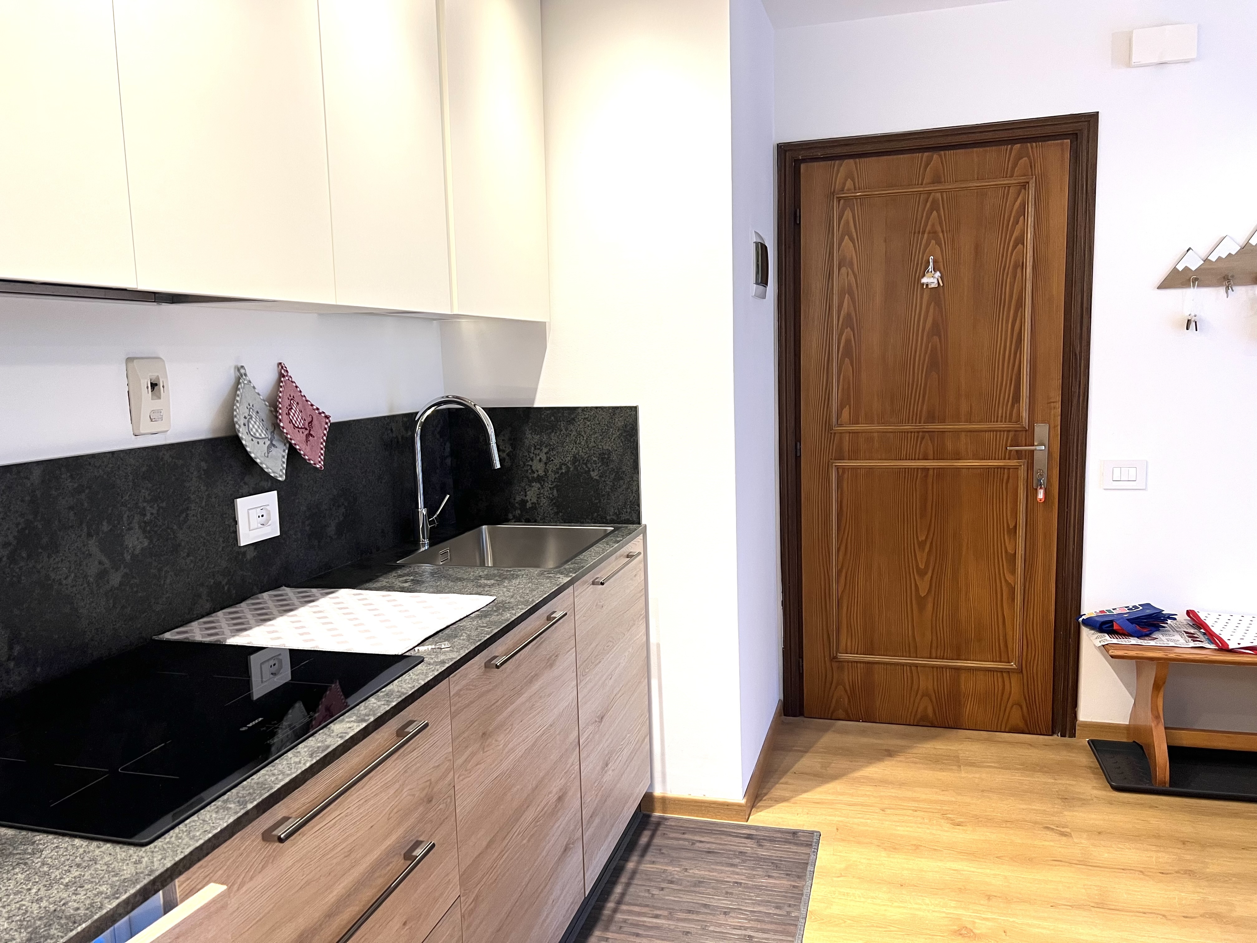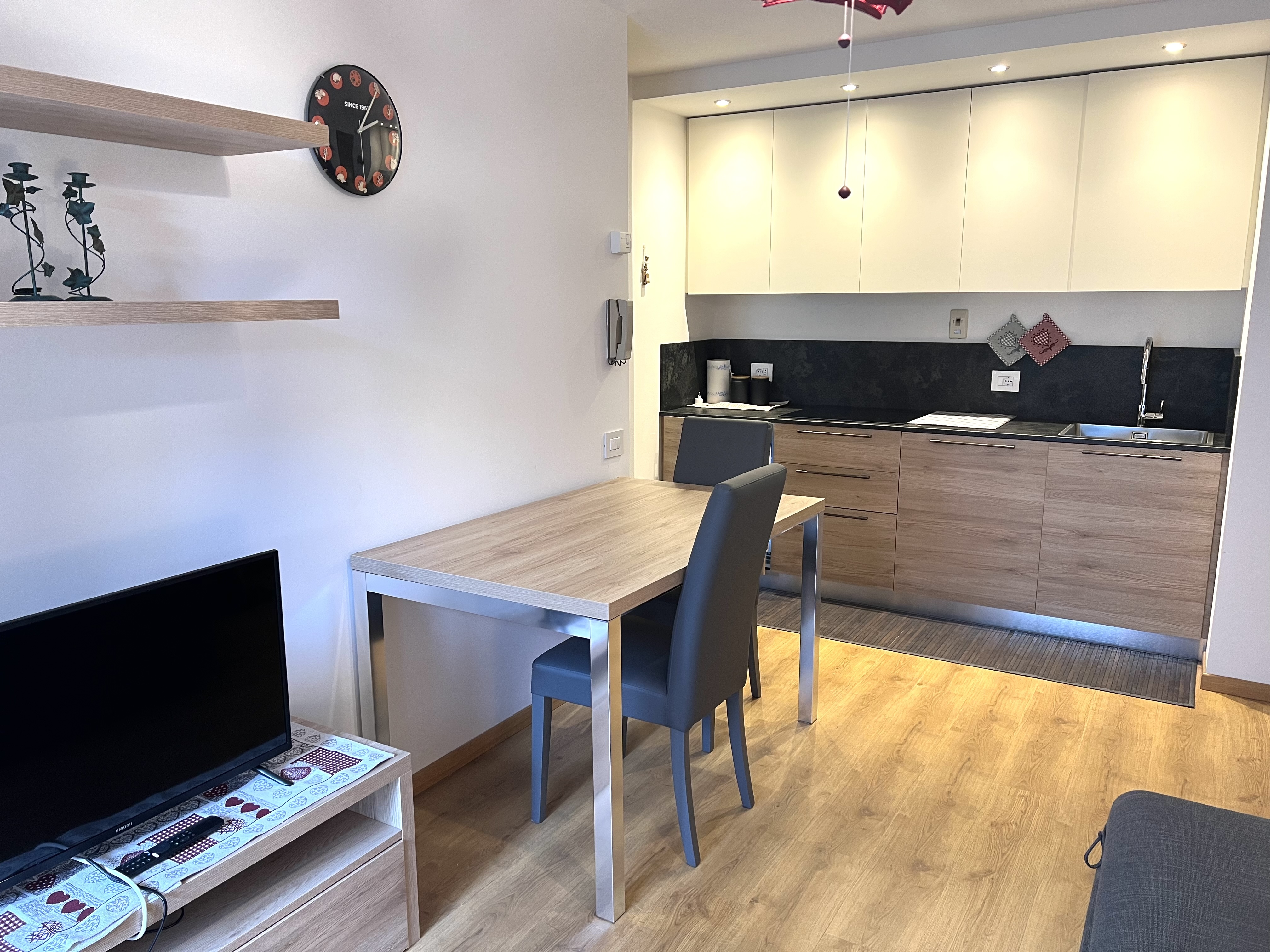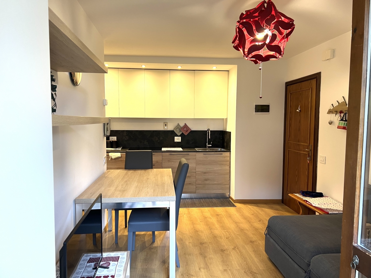 Appartamento bilocale completamente ristrutturato internamente, disposto a pian terreno, composto da accogliente soggiorno-pranzo con angolo cottura e balcone, camera da letto e bagno con finestra. Venduto con box auto.