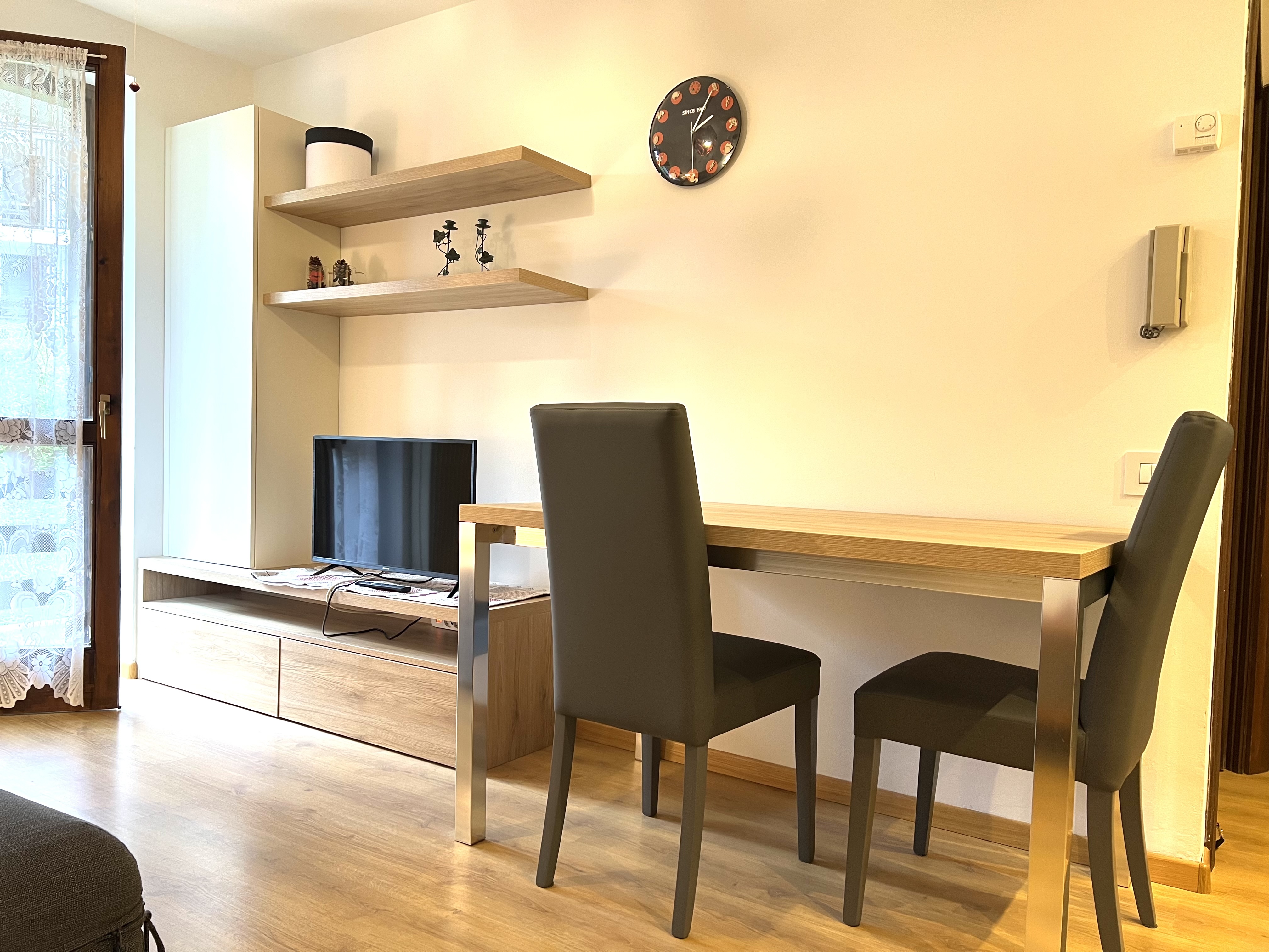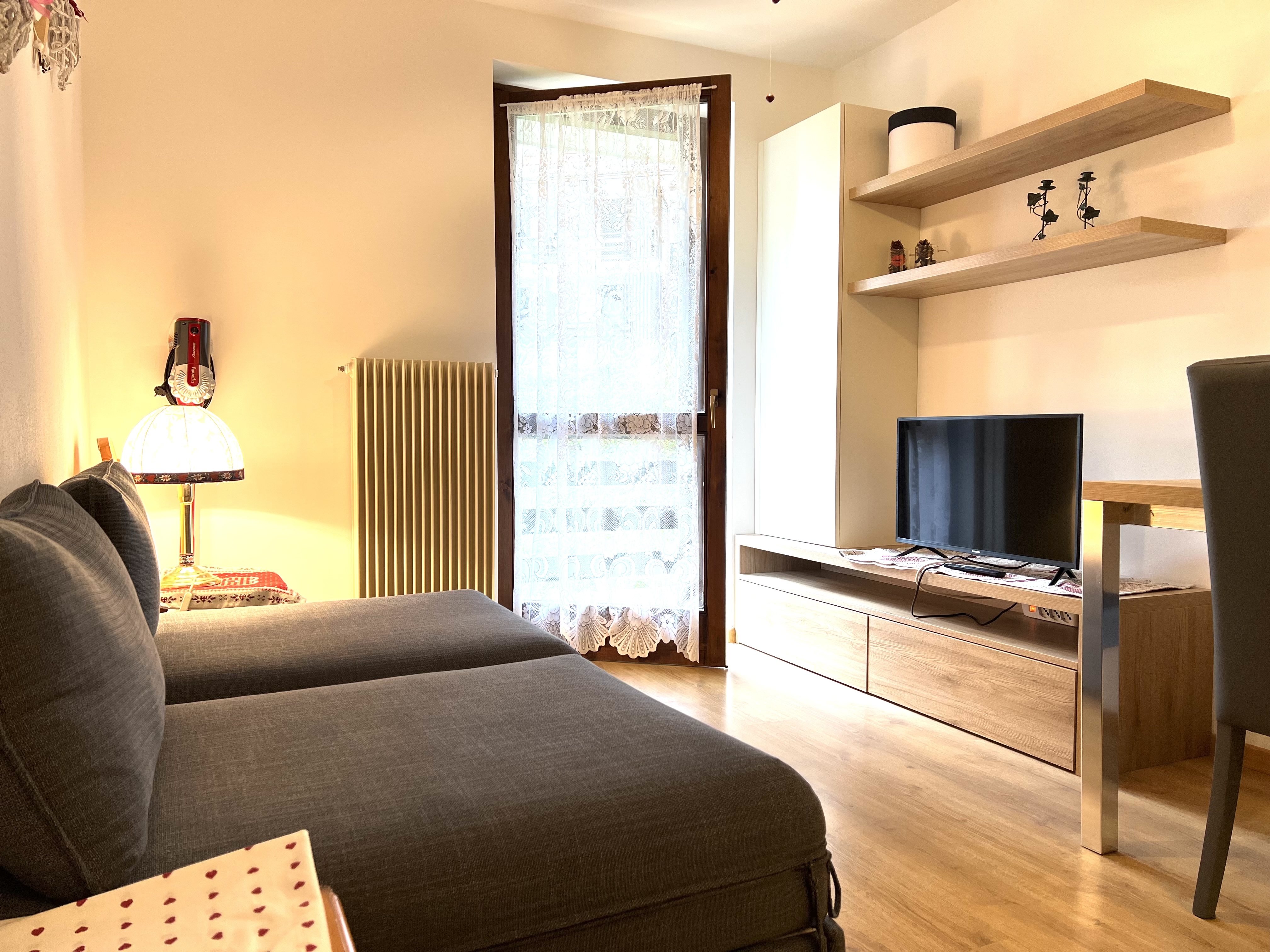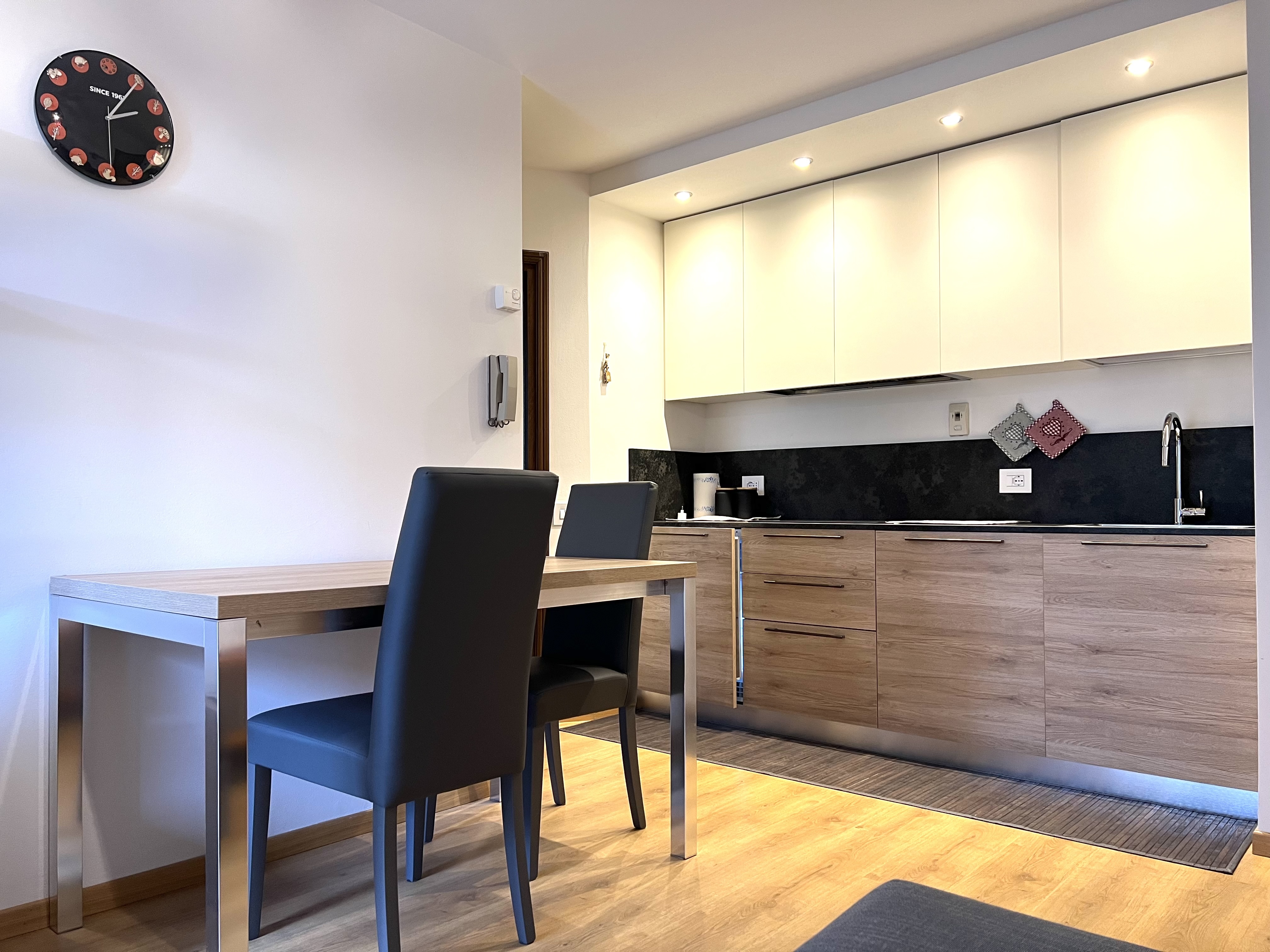 Appartamento bilocale completamente ristrutturato internamente, disposto a pian terreno, composto da accogliente soggiorno-pranzo con angolo cottura e balcone, camera da letto e bagno con finestra. Venduto con box auto.